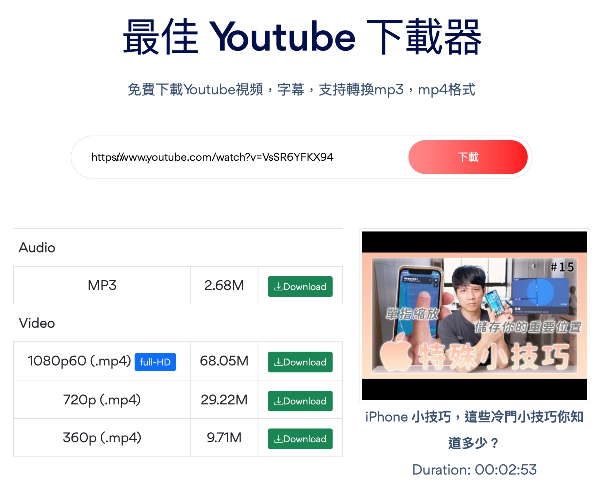- 免費且高品質的youtube視頻下載和解析,如360p、1080p、SD、HD、FullHD、2K和4K。