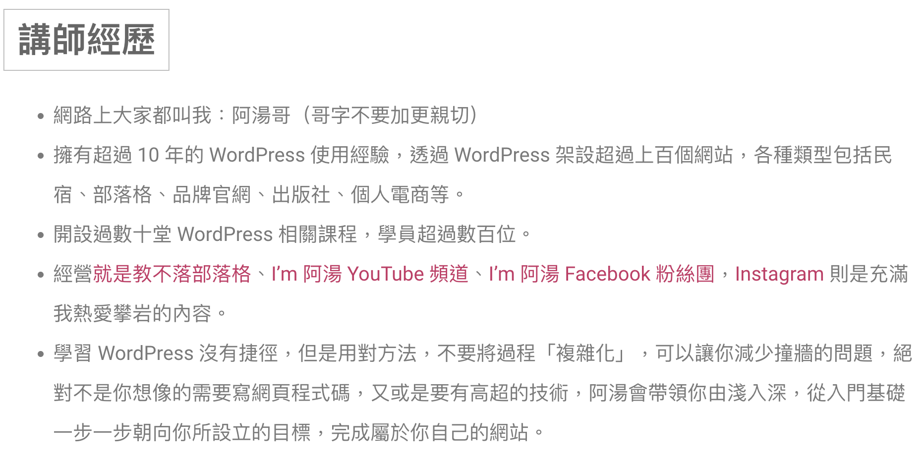 講師嘛,當然就是我本人,我已經使用 WordPress 超過十年以上,不僅是使用,也非常的研究,開了很多課,做了無數個網站,你絕對可以相信我的專業。