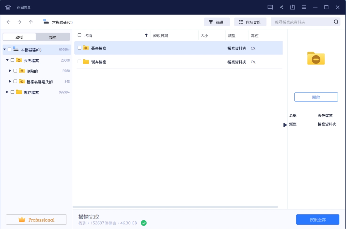掃描會依據你的容量大小,時間會有所不同,像我這 256GB 的容量,大約掃描花費 20 分鐘左右,當然,你有明確的掃描位置,知道是特定資料夾的話,掃描速度就會更快,不需要整個找,基本會透過路徑來分類,另外還有類型。