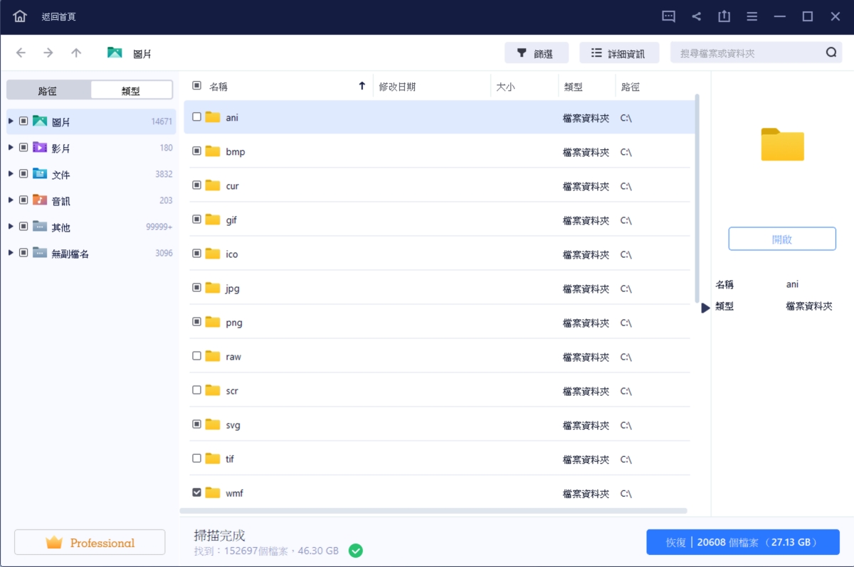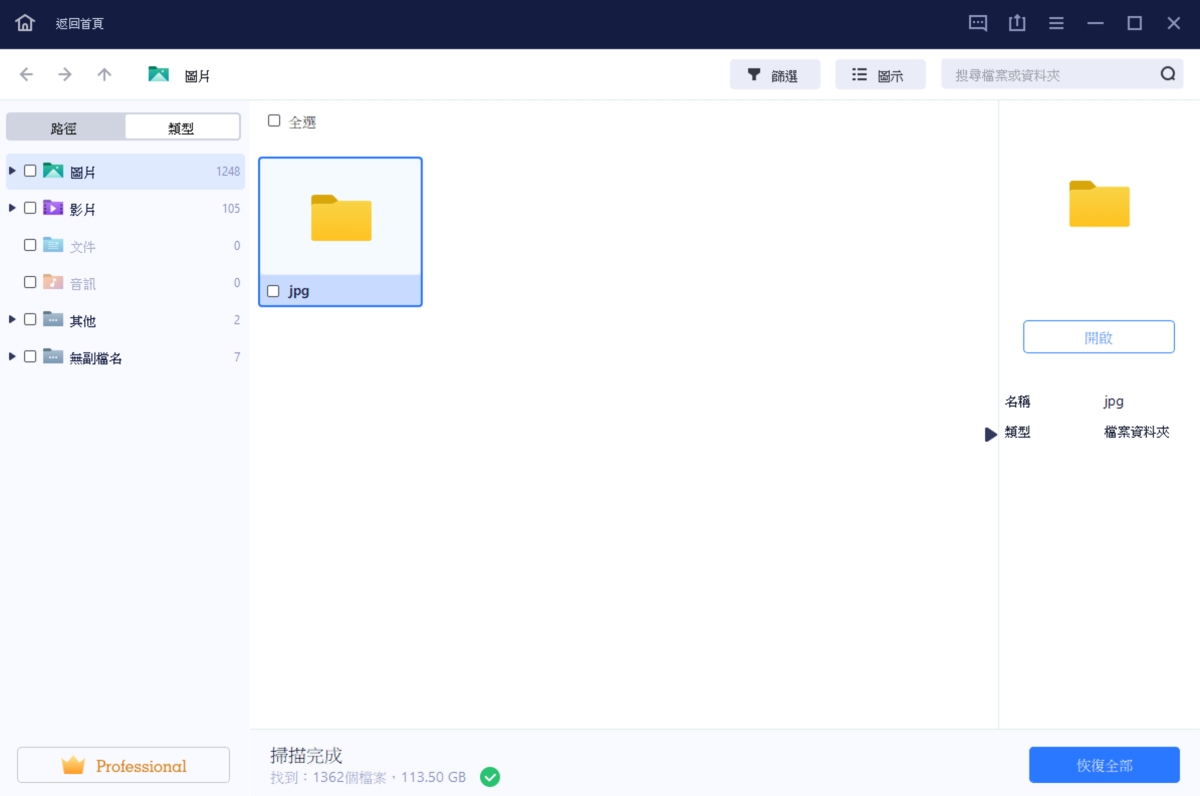 類型就是依檔案不同格式來分類,阿湯自己主要也是用類型來找想要還原的檔案比較快。