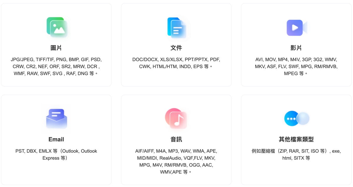 能夠救援的資料類型基本上也是統包,全部都有,不論是圖片、文件、影片、音樂等,通通都掃描的到,通通都可以復原回來。