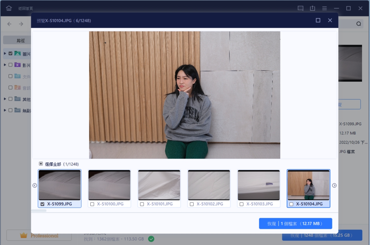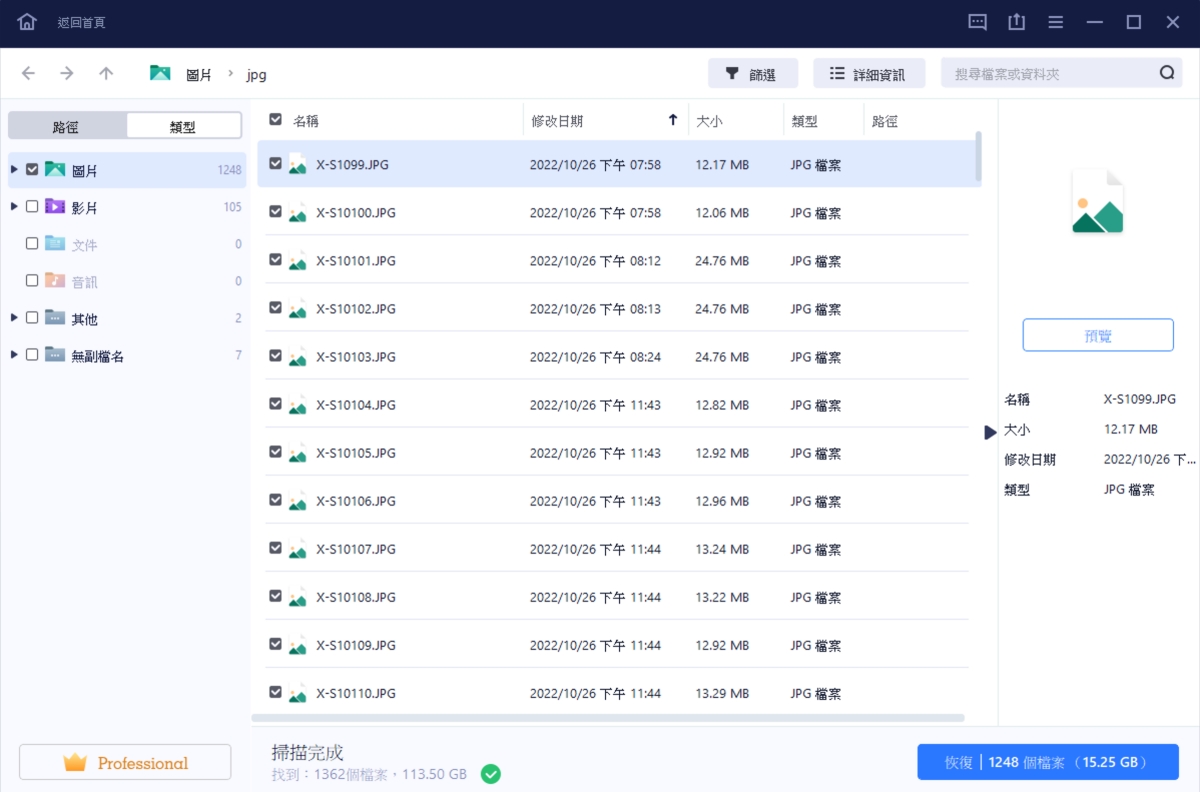 掃描這張 128GB 記憶卡大約花費 30 分鐘左右,畢竟是 SD 卡,速度比較慢也是正常,最終掃描出來的圖片包括 1248 張、影片 105 支,非常的多,我們來試看看還原。