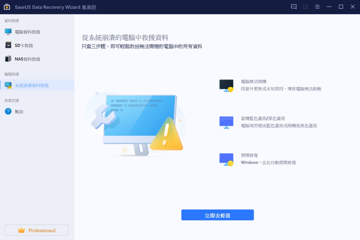 最後一個是進階救援,主要是針對,電腦無法開機、當機、Windows 一直在循環修復進不到桌面,這時可以透過另一台電腦使用 EaseUS Data Recovery Wizard 製作一個開機救援隨身碟,透過他來開機進行修復,讓你因為無法開機的狀況順利獲得解決。
