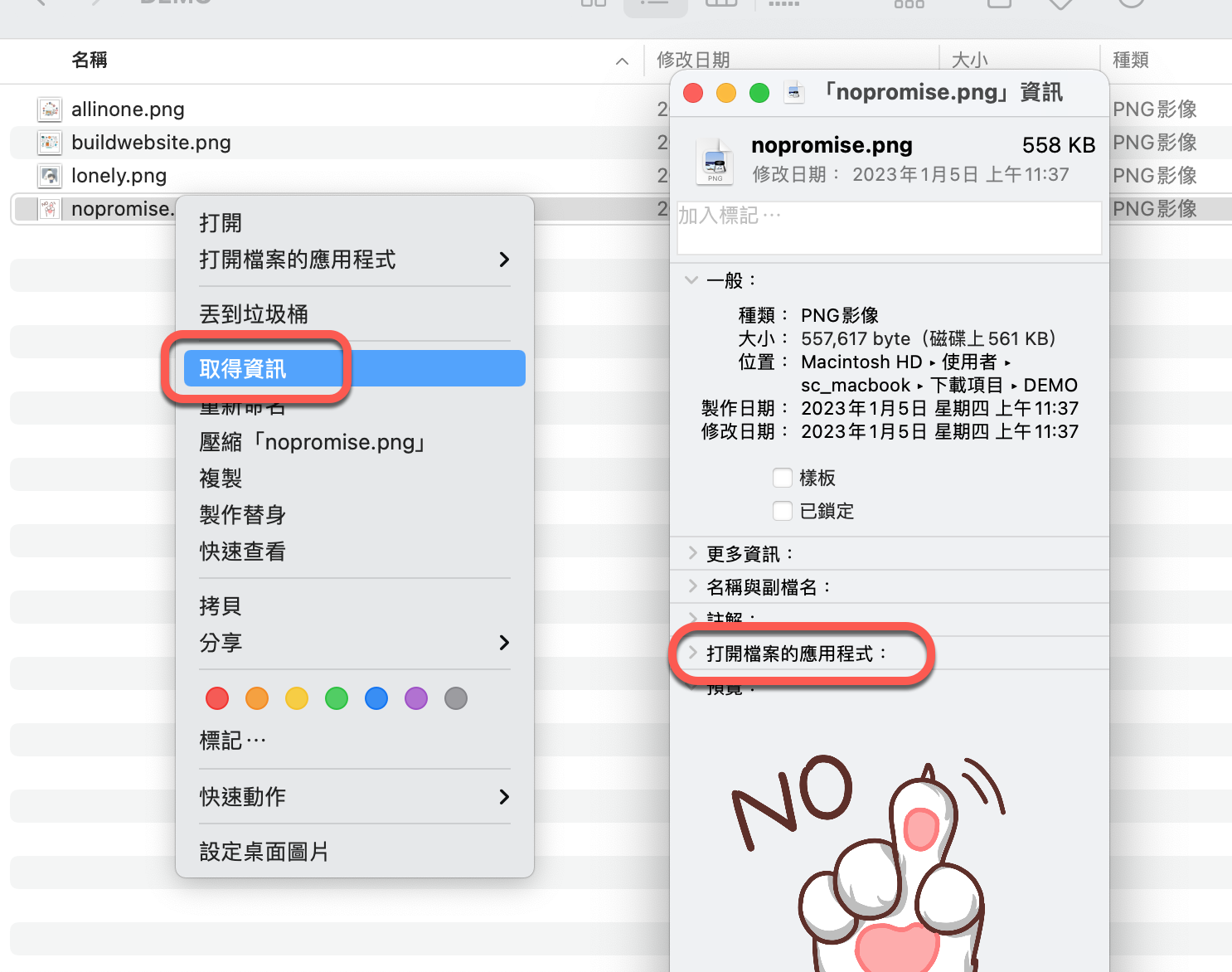 在該格式的任一檔案右鍵進入「取得資訊」,然後展開「打開檔案的應用程式」。