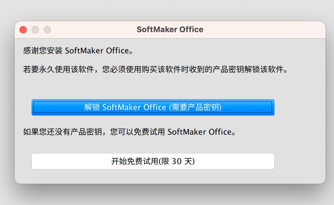 然後這邊就可以點擊解鎖 SoftMaker Office,然後輸入 Email 中所提供你的序號,就可以正式啟動軟體了。