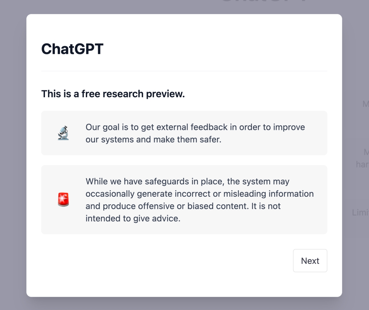 註冊成功後就可以進入來和 ChatGPT 聊天,前面是告訴你一些提醒,ChatGPT 會收集所有的問答內容,基本上就是靠大家來進化的。