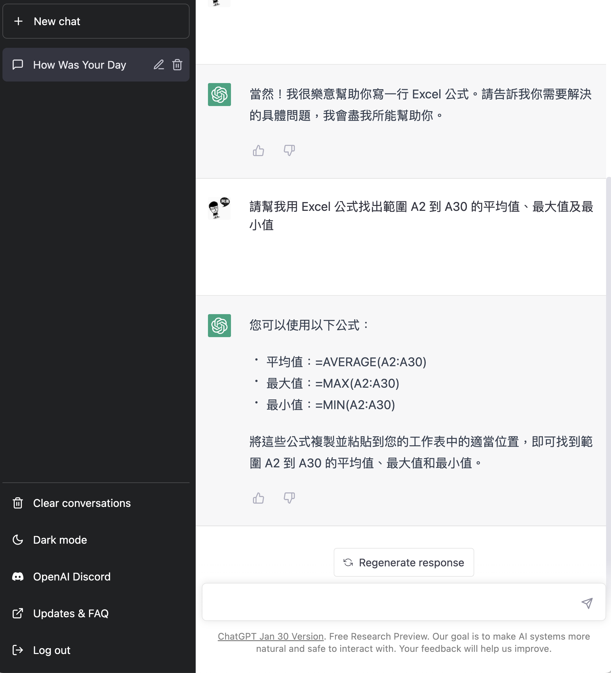 再來試了個簡單的,找出範圍內的平均值,最大值跟最小值,一樣輕鬆搞定,也太強大了吧,大家快去試試,對你寫 Excel 很有幫助。