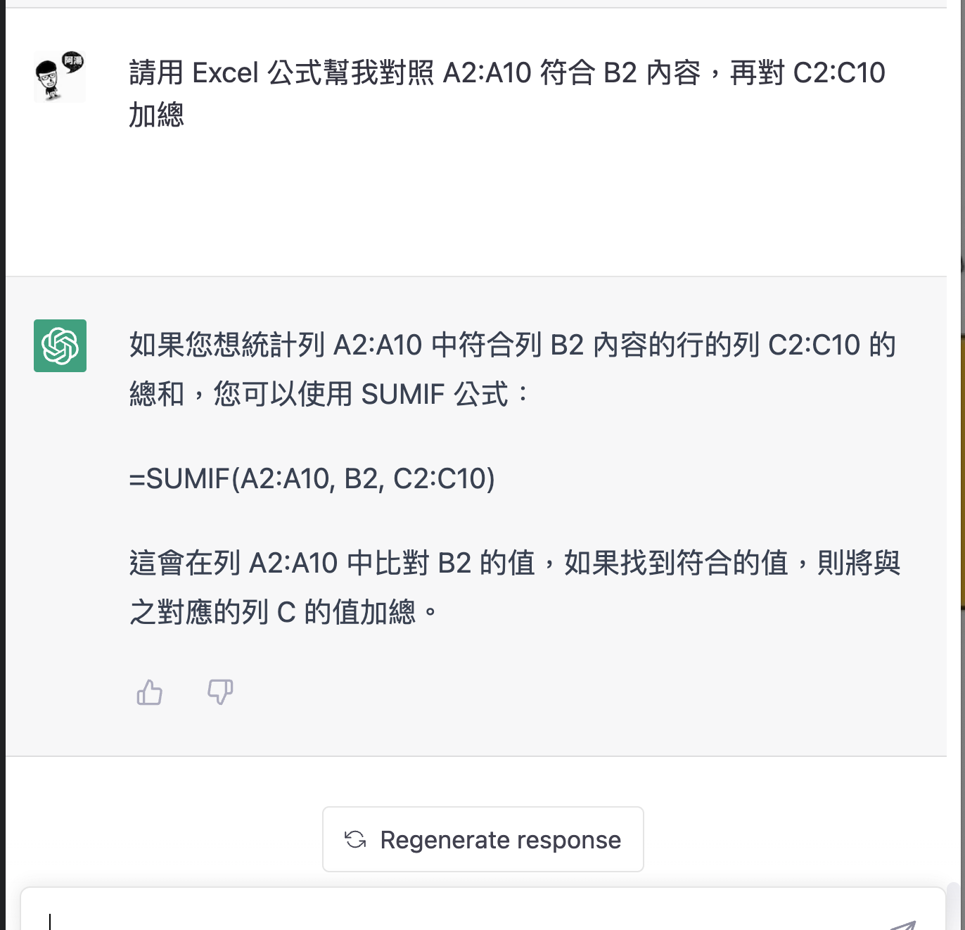這邊簡單的試了二個,第一個是要他對照 B2 內容後,加總 C2:C10,大概 10 秒左右它就幫我寫出來了,只要你描述的欄位夠清楚,基本上都沒有問題。