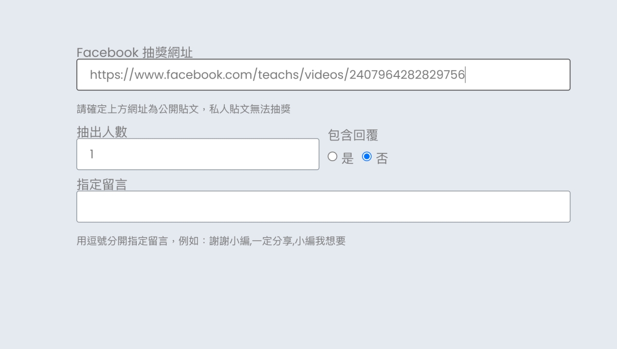 這邊會需要你貼上 Facebook 貼文的網址,然後輸入要抽出的人數,如果有指定留言內容也能在下方輸入。