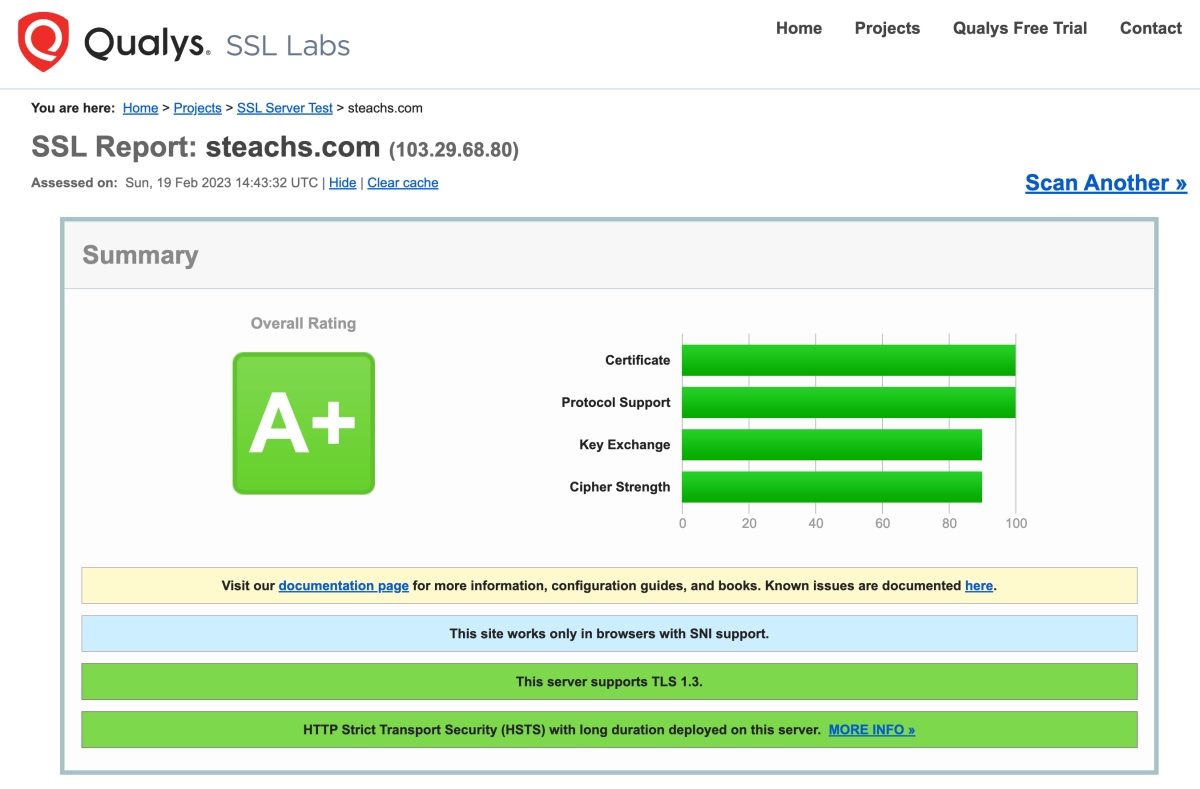 首先會顯示你的憑證等級,基本上只要 A 以上就可以,如果你是透過虛擬主機安裝,大部份都會是 A,要 A+ 通常要自己調校比較有機會。