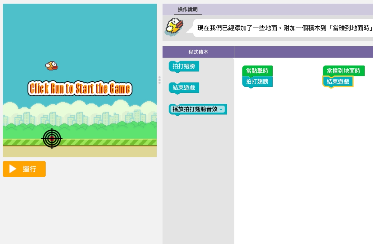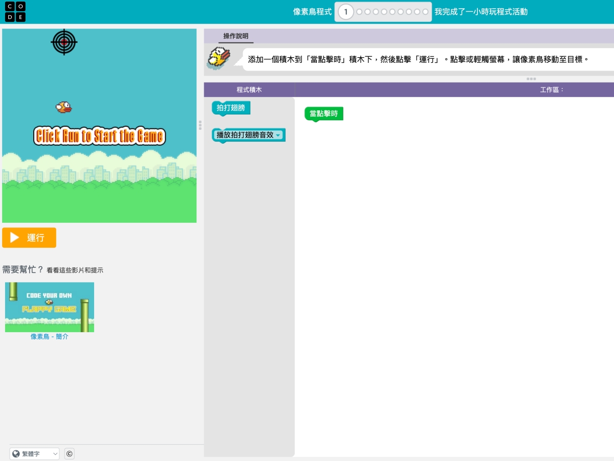 再來像是這個 Flappy 小遊戲,這算是很知名但不難的一款小遊戲,這邊進入後(如果是英文想切成中文,在左下角有語言可以選擇),就會一關一關帶你來了解程式基本結構,比如第一關是,當點擊畫面時,會有什麼效果,你只要把拍打翅膀拉到當點擊時的下方。