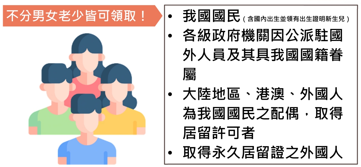 可以領取的對象,基本上只要是台灣人(含外籍配偶)或有永久居留證的外國人都可以領取,不分年齡。