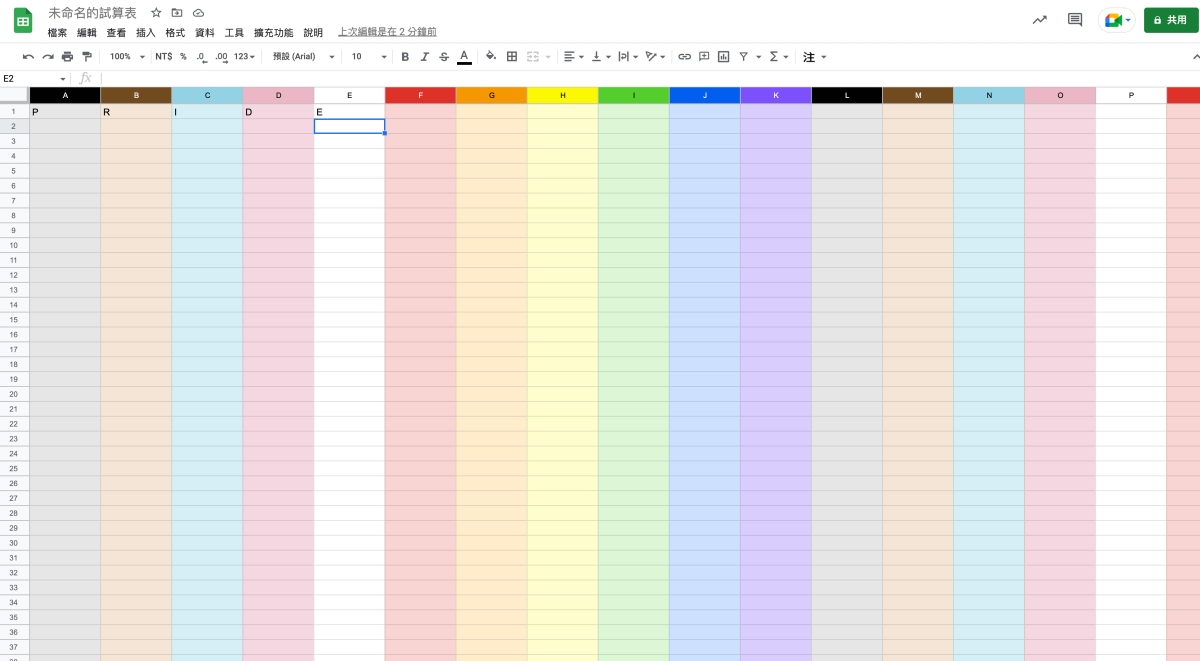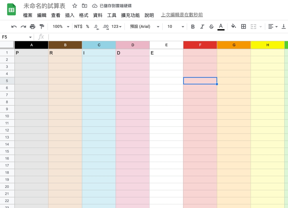 首頁 › 電腦小教室 › 隱藏小彩蛋,讓 Google 試算表秒填滿彩虹色! 隱藏小彩蛋,讓 Google 試算表秒填滿彩虹色! 發佈日期:2023/2/28 作者:阿湯 分類:電腦小教室 今天要分享的這個小彩蛋,其實已經不是新東西,早在 2018 年就有的功能,雖然不是實用的,但是算有趣的功能,只要打上五個英文字,就能讓 Google 試算表整個很彩虹,這個實是 2018 年時,Google 因應同志驕傲月在試算表中加入的小彩蛋,不過我自己覺得也算蠻實用的,如果你本來就打算每欄顏色不同,就可以直接用這招快速填色上去,來看看怎麼做吧。 讓 Google 試算表秒填滿彩虹色! 先給大家看看成果,就長這樣,符合支持同志的彩虹配色,其實有時表單在分隔不同的內容時,也確實會每欄不同啊。 想要弄出這樣的效果很簡單,只要在 A1~E1 分別填入「PRIDE」,不分大小寫,馬上就會整個變成彩虹了。 而刪除其中一個字掉,效果就會立刻消失,所以如果你是認真要使用的話,就把第一行隱藏起來,從第二行開始使用就好。 至於直的就不行,大家就不用試了。