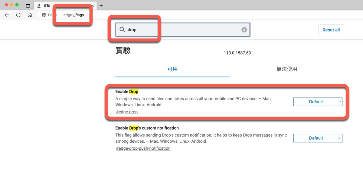 目前 Drop 功能只在版號 110 後才有支援,而且是處於實驗功能,還沒正式放到檯面上,所以我們要先手動開啟,就跟 Chrome 一樣的概念。 首先在瀏覽器網址列輸入「edge://flags」,然後搜尋 drop,將 Enable Drop 後方的選項改成 Enabled,再重啟瀏覽器。