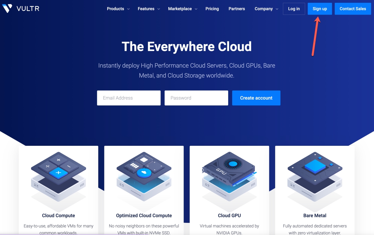 首先要有 Vultr 的帳號,進入官方網站後,點擊右上方的 Sign up 進行註冊。