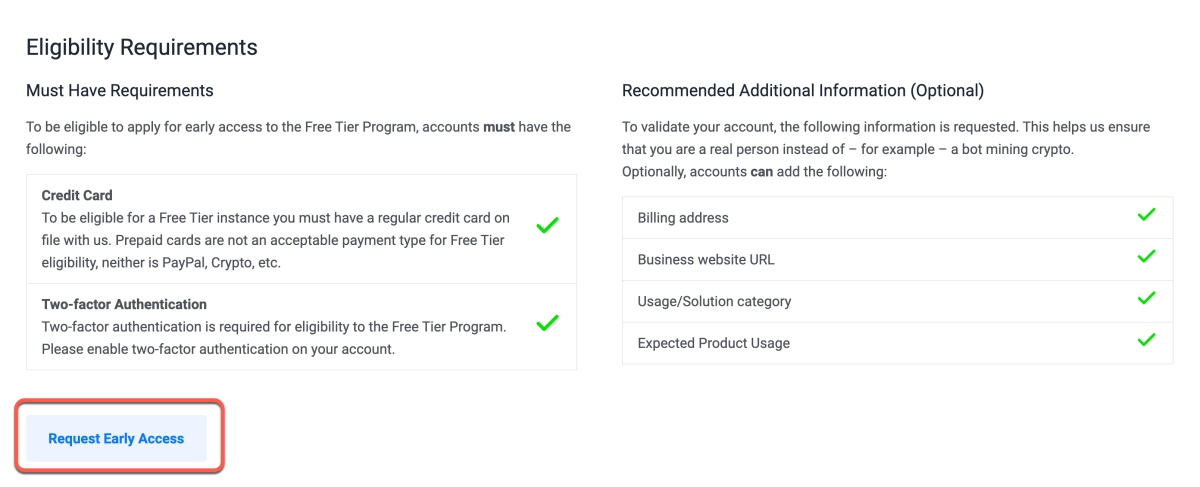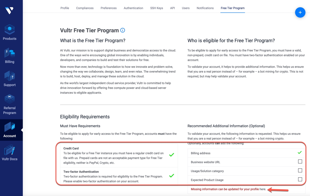 上面二個完成後,就可以在 Account 中進入 Free Tier Program,下方可以看到你完成的項目有哪些,左邊二個是必要條件,也就是我們剛完成的付款綁定及二階段驗證,右邊的是選填條件,主要是完善一些基本資料,如果想要填多點加分題,下方的 Here 進去就可以了。