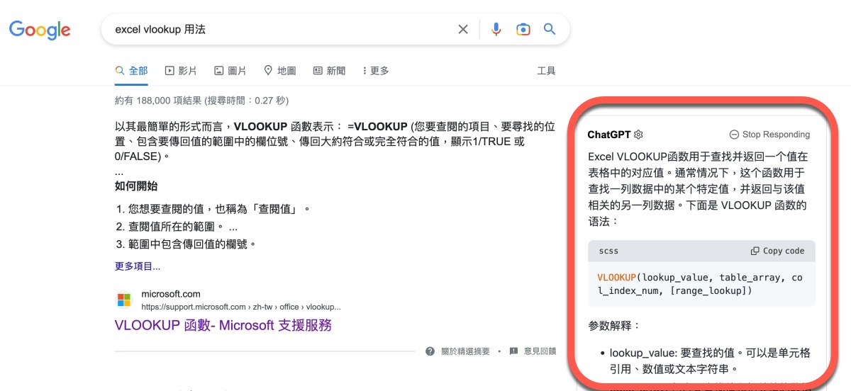 而另一個重點用法,就是當你在 Google 搜尋時,會直接在搜尋結果的右側,直接顯示 ChatGPT 的結果,這個部份我覺得真的超棒,直接就有結果可以參照,有在使用 ChatGPT 的人應該會很喜歡這個套件。
