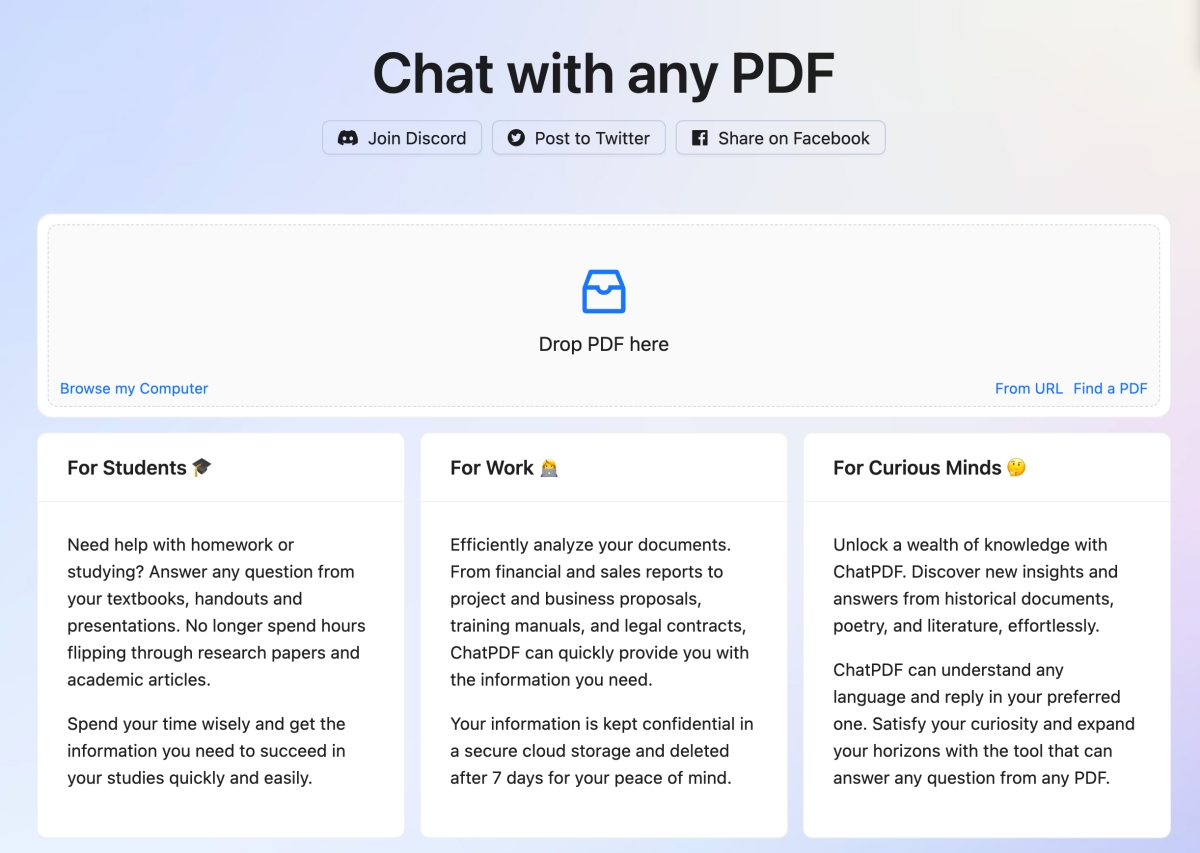 ChatGPT 之後,我也介紹了一連串有關 AI 的服務,以前的 AI 能做的真的沒有很多,但這二年真的是突破性的發生,很多服務都來的太快,快到我差點要吸收不良,像今天要介紹的這個服務叫做 ChatPDF,如同其名的,主要是為了 PDF 而生的 AI 服務,只要將 PDF 的內容丟給他吃之後,就可以幫你精簡整個 PDF 的內容,給你重點,或者你可以對它發問,直接問你想要知道的部份就好,對於讀 PDF 內容或者整理重點有很大的幫助。