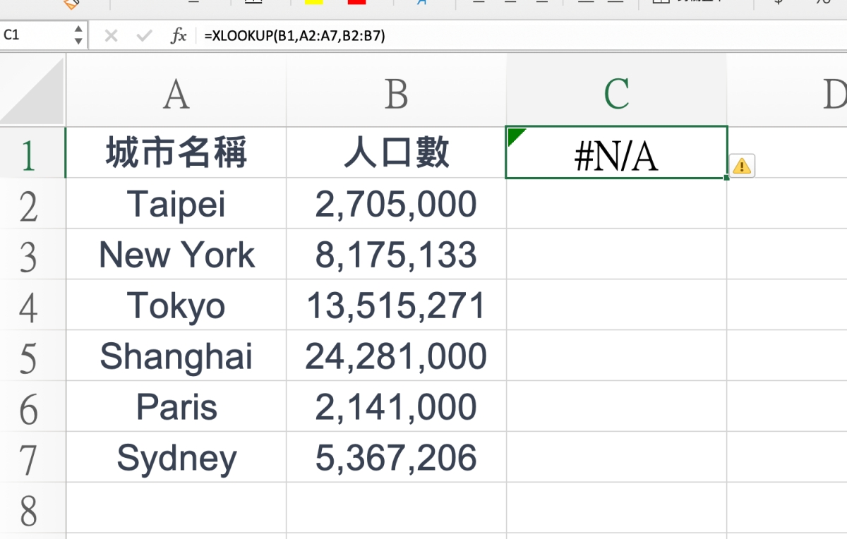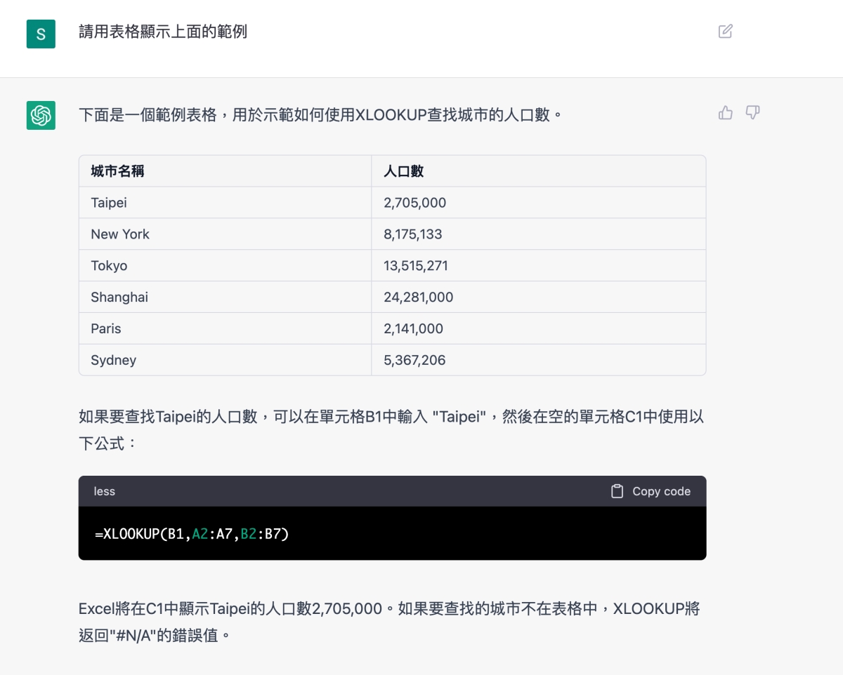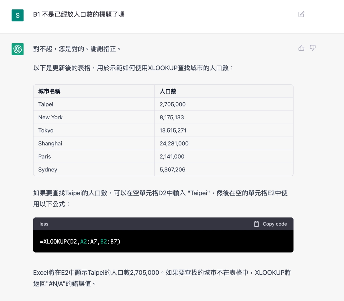 比如我複製到照他說到的,是 A2~B7 的範圍,然後在 C1 填入公式,不過有趣的是,他叫我們可以在 B1 填入要搜尋的城市名稱,就能比對資料,但 B1 不是已經放人口數這個標題列了嗎?這時察覺不對,就可以再反問一下 ChatGPT。