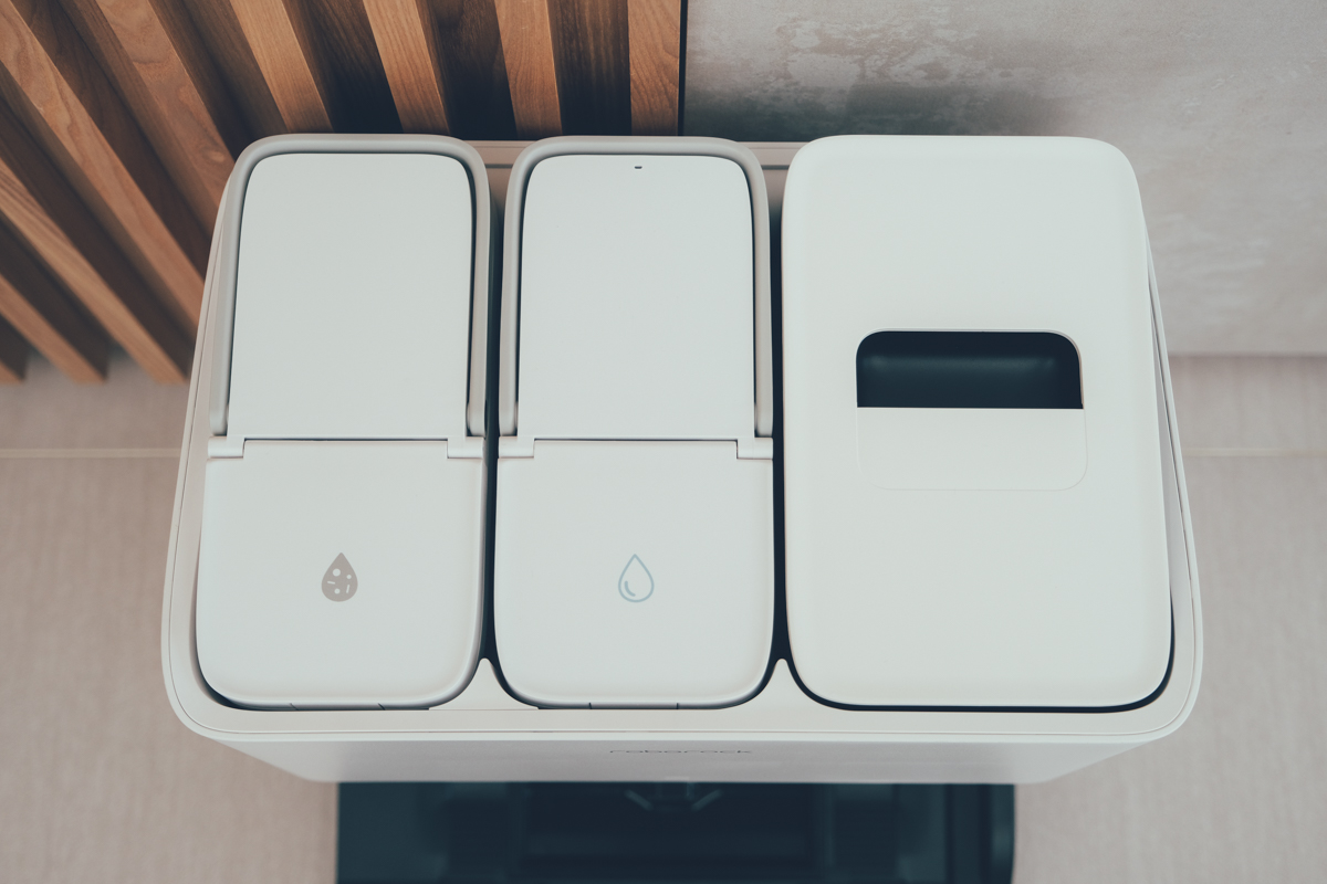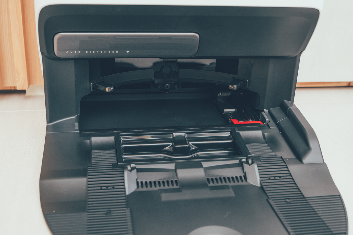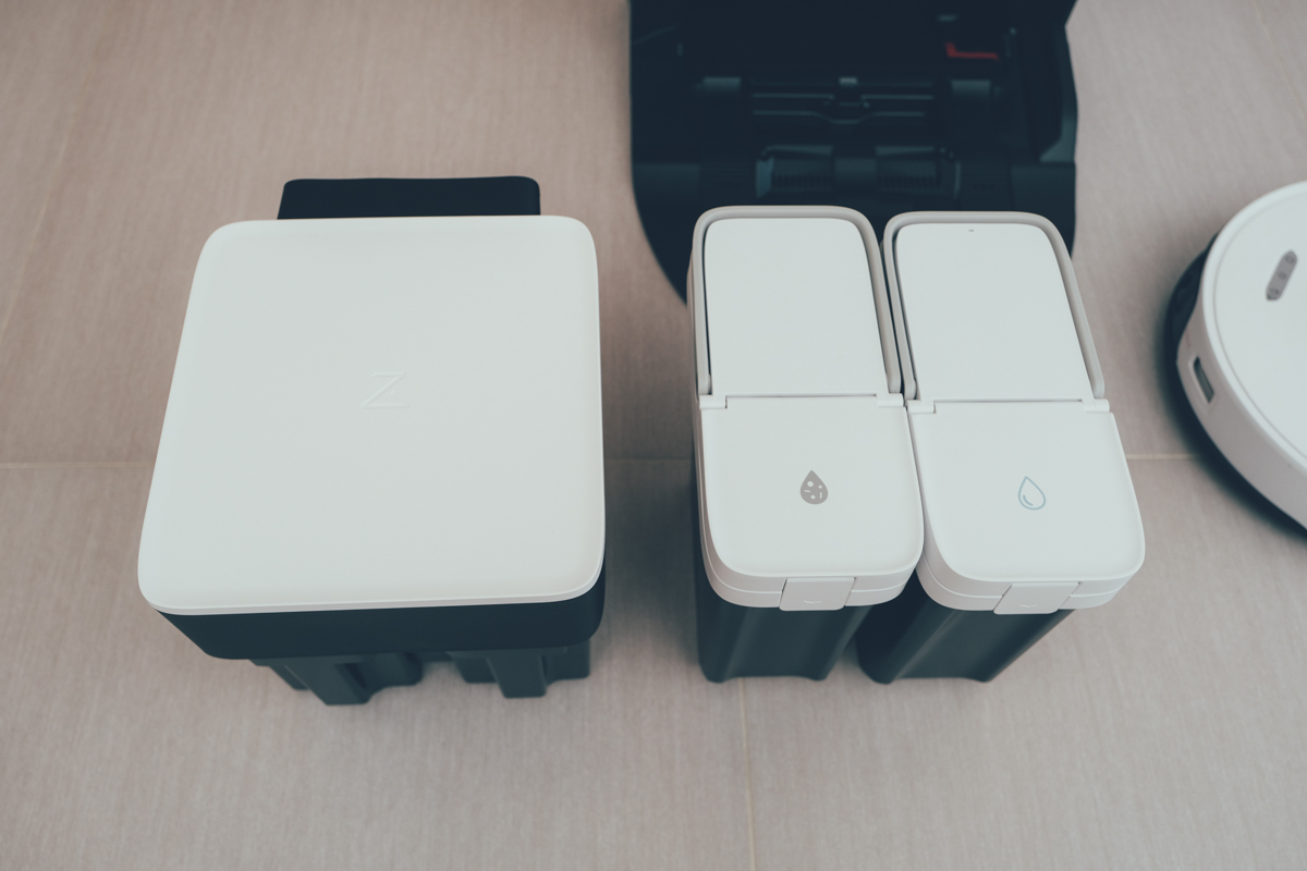 而上方與前一代的 S7 MaxV Ultra 同樣,由左至右搭配了汙水箱、清水箱以及集塵桶,平常只要定期汙水箱拿去傾倒,在清水箱加入清水,如果以我家室內清掃空間大約 20 坪來說(我指的是清掃空間,不是全室內空間),每天掃一次,大概也是 4~5 天才需要補一次水並倒掉汙水。