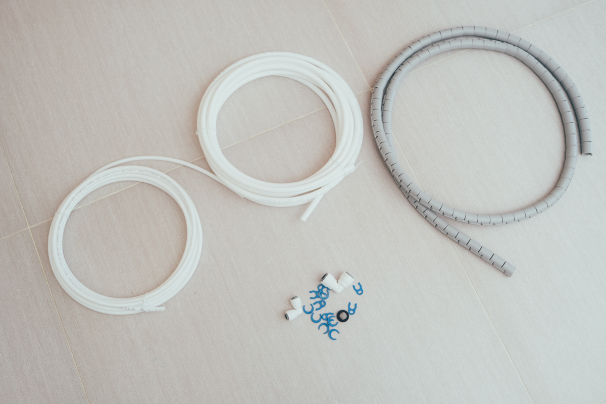自動上下水套件,標配是附各一條 6m 的管線以及一組收線管,另外還有二個轉彎使用的轉接頭,如果 6m 不夠你使用的話,其實這水管的管線也不是特規,你去五金行都能買的到,可以自行買更長的來接。