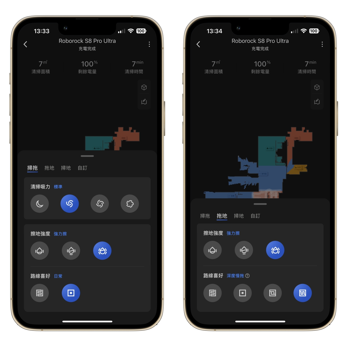 設定掃地、拖地時,除了各別的強度選擇外,如果你想要特別的再強化一次拖地,也能在進行一次清掃後,單獨的再拖地一次,在拖地模式下是非常安靜的,即便是大半夜進行拖地模式也沒問題。
