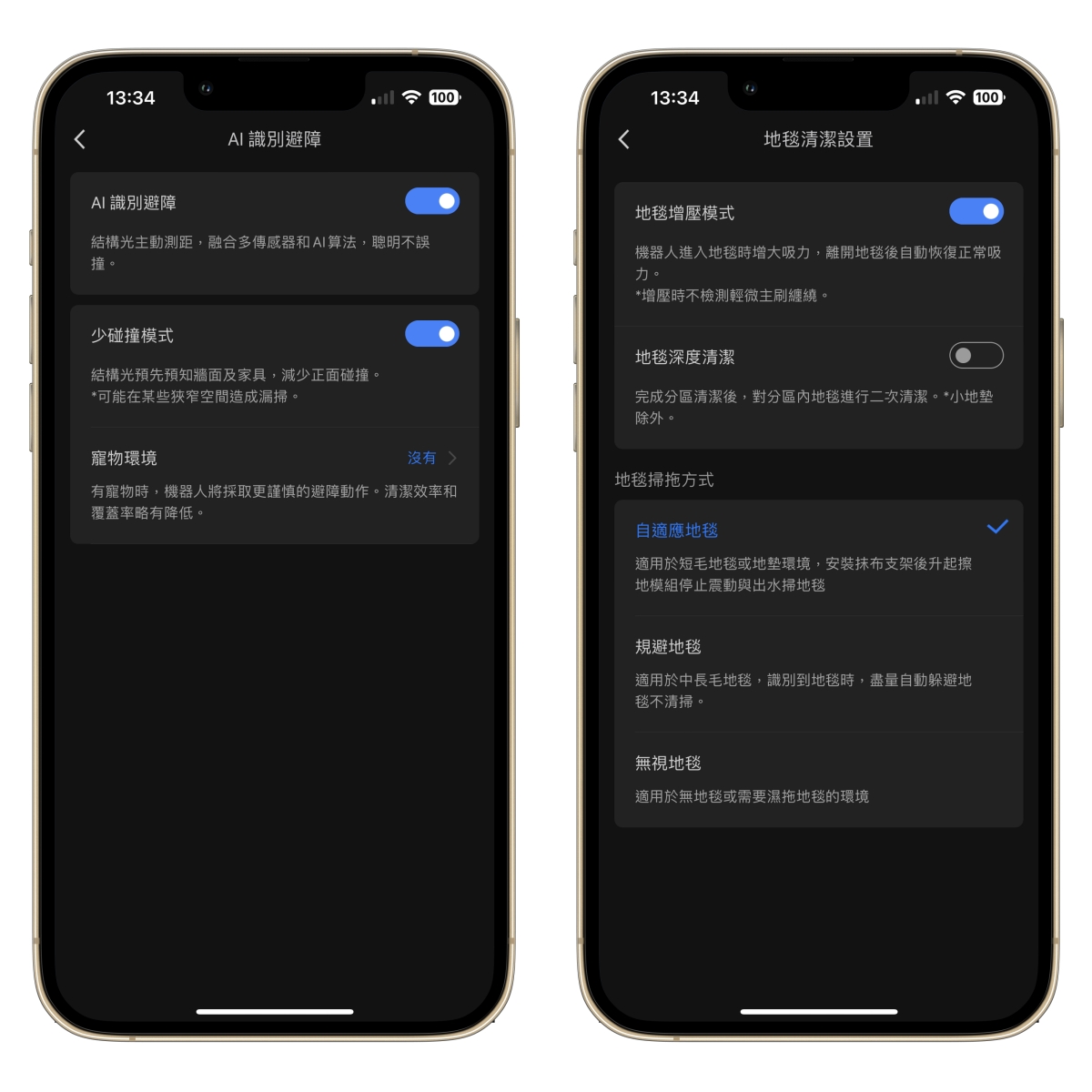 在清潔的部份,在 AI 的識別避障功能中,還可以開啟少碰撞模式,透過 3D 結構光預先辨別牆面跟家具,就可以滅少碰撞的問題,而地毯的部份,你可以選擇要深度的清潔或是直接避開,完全由你來決定。