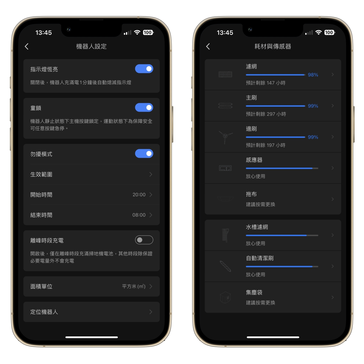 支援兒童鎖以及離峰時段充電,離峰時間充電有個好處,就是省錢,雖然掃地機器人的充電電費佔不了多少費用,但就積少成多啦,現在很多電動車的 App 也都可以設定充電時間,長期下來還是會省到,另外掃地機器人的配件真的很多,你可能會忘記什麼東西要更換,可以直接到「耗材與傳感器」這裡來查看,有詳細的幫你計算還剩餘多久時間要更換,就不用自己在那記東記的,這是為什麼我希望有要換耗材的家電都要有 App,就算沒什麼功能好操作,耗材就是最重要的資訊了。