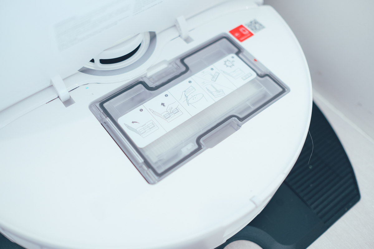 上蓋掀開後,裡面放置的是集塵盒,不過這個塵集盒大致上,除了更換濾網外,應該沒有拿出來的機會,因為我自己試了一週下來,每次掃完回充,10合1清潔座都將髒汙回吸的超級乾淨!