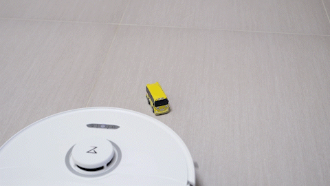 這個部份,我準備了幾個家中比較容易遇到的,首先,第一個是玩具,大的沒什麼,我們直接來試試小玩具,這高度大概只有 3 公分,可以看到掃地機完全沒碰到它,一點都沒移動。