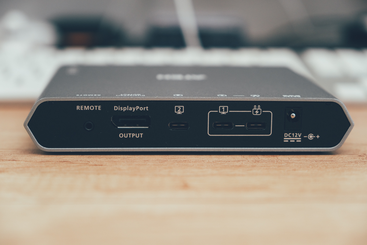 另一面由左至右,分別是切換控制鍵連接埠,DisplayPort 輸出連接埠(用來接你要顯示的螢幕),再來是二組 USB-C 的電腦連接埠,二台主機分別接到螢幕 1 及螢幕 2 的圖示位置,另外螢幕