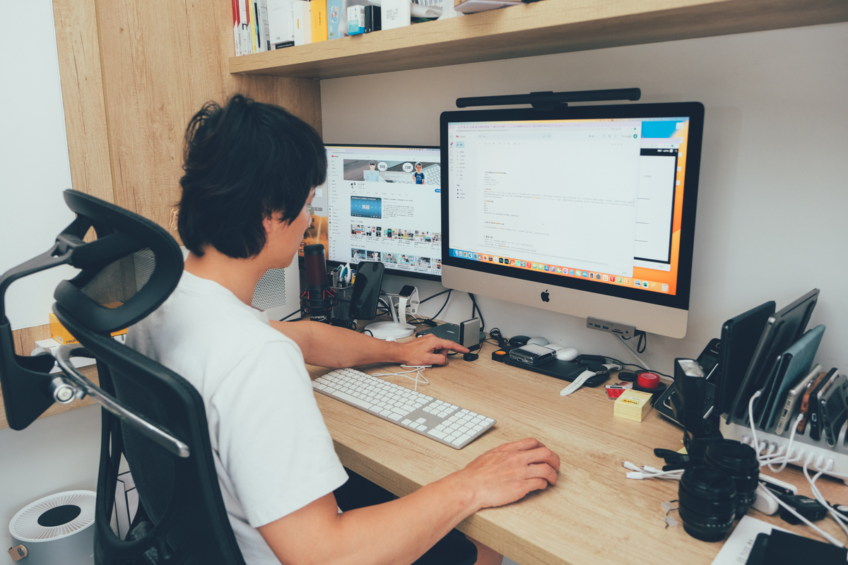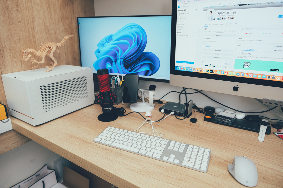 先給大家看一下我的工作區域,目前是左側一台 Windows 的準系統主機,右邊則是平常主力使用的 iMac,而左邊的螢幕 HDMI 1 是接 iMac 做為第二螢幕,HDMI 2 是接 Windows 主機使用,同時提供給二台電腦切換使用,平常要切換時就是直接透過螢幕切換,鍵盤滑鼠則是分開各一組,雖然談不上困擾但是真的蠻佔用空間的,但當我有其它週邊要切換到 Windows 主機上使用時就很麻煩,要拔來拔去。
