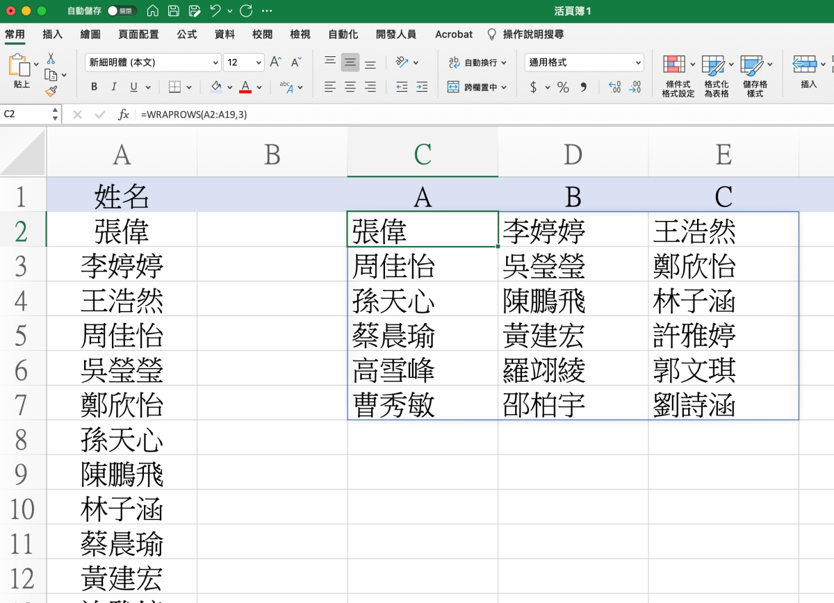 =WRAPROWS(名單範圍,要分成幾組)