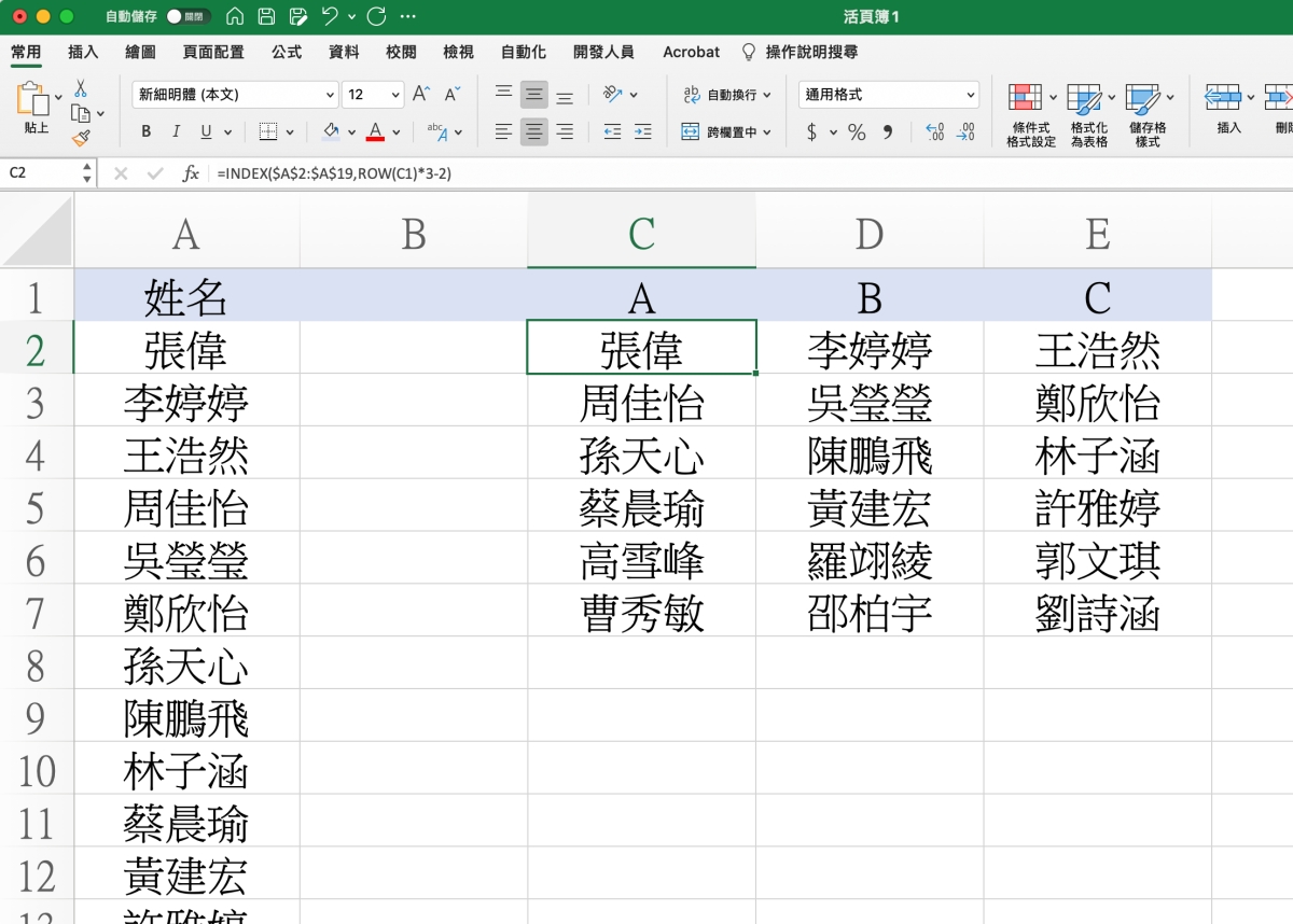 首先,我們需求像這樣,有一組名單,我們想要讓他直接照順序填入 ABC 三組,要怎麼做呢,下面我分成二種說明,來看一下。