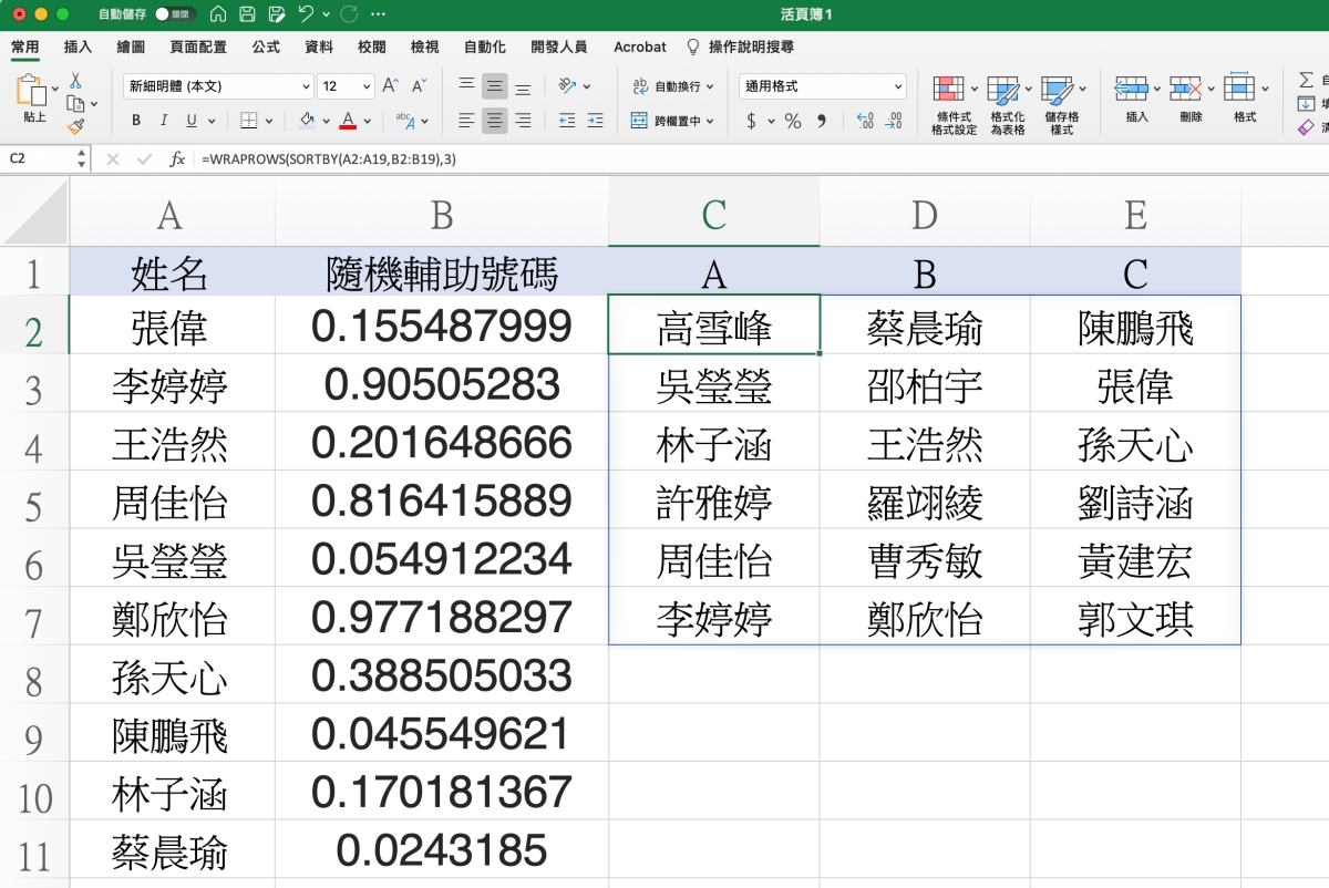 再來是隨機分組的部份,如果你只需要在名單後方填入組別,那麼可以參考這篇: