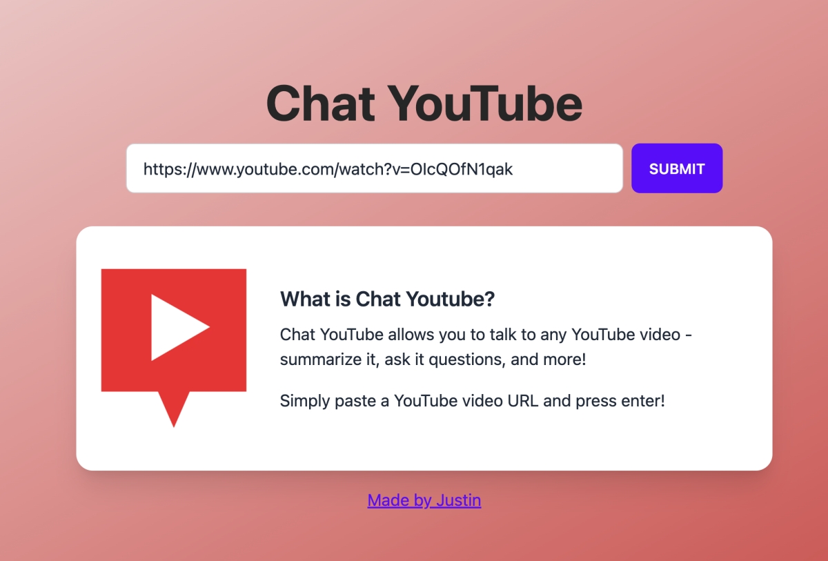 網站:https://chatyoutube.com/這工具其實和很多人分享過的 YouTube Summary with ChatGPT 功能大同小異,只是我覺得 Chat YouTube 的使用上更接近一般人,怎麼說,因為只要填上網址就能產出,完全不用做其它動作,一樣可以對影片內容發問,非常方便。 進入網站後,將要摘要的影片網址貼上去送出。