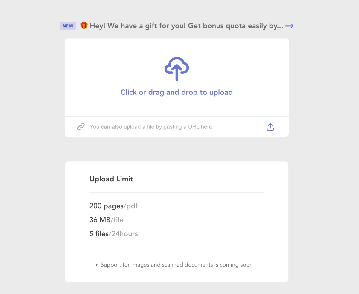 接下來就可以上傳檔案,免費使用的情況下,檔案目前最多可以上傳 200 頁的 PDF,且單檔不超過 36MB,並且 24 小時內最多上傳 5 個檔案。