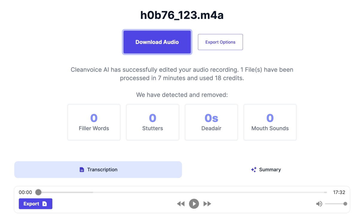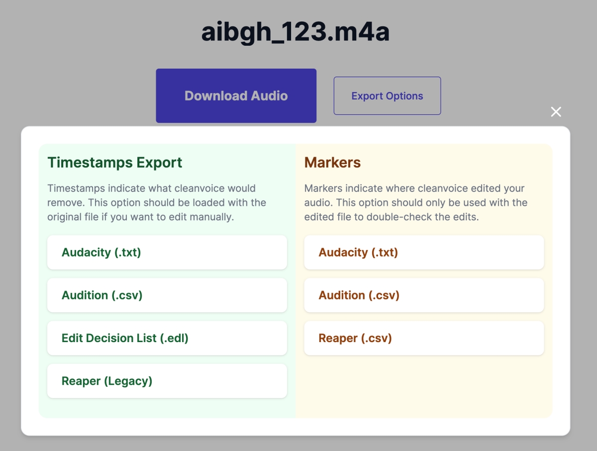 以預設的處理來說,處理完後就可以直接下載音檔,在 Export Options 裡主要是可以下載更多剪輯相關資訊。