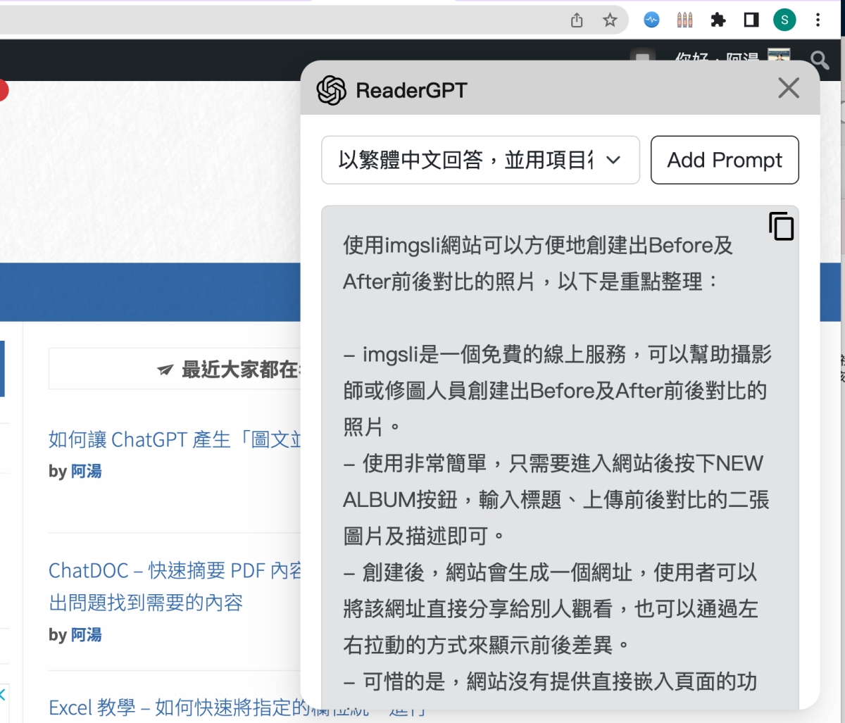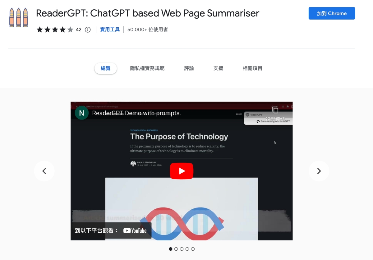 透過 ChatGPT 所衍生出來的便利工具愈來愈多,這些工具本質上都還是透過 ChatGPT 來回答,只是讓你更快的去使用,不用自己貼上內容,比如今天要分享的 ReaderGPT,可以讓我們在閱讀網頁內容時,只要按一下,就可以讓 ChatGPT 整理內容,並列出重點給你,而 ReaderGPT 做的事,很單純的只是把這網頁的內容貼去給 ChatGPT 讀取後幫你摘要內容,你自己也能做到,但透過 Chrome 套件省去複製貼上的動作,也不用每次講指令,其實還蠻方便的。