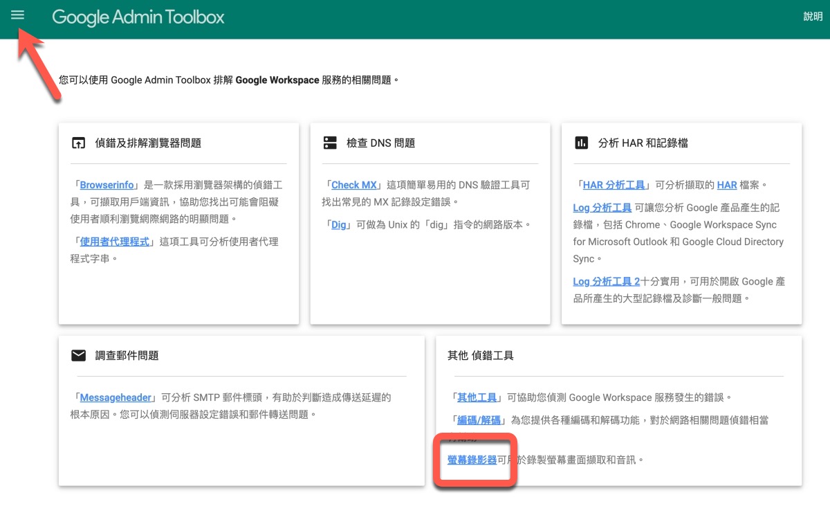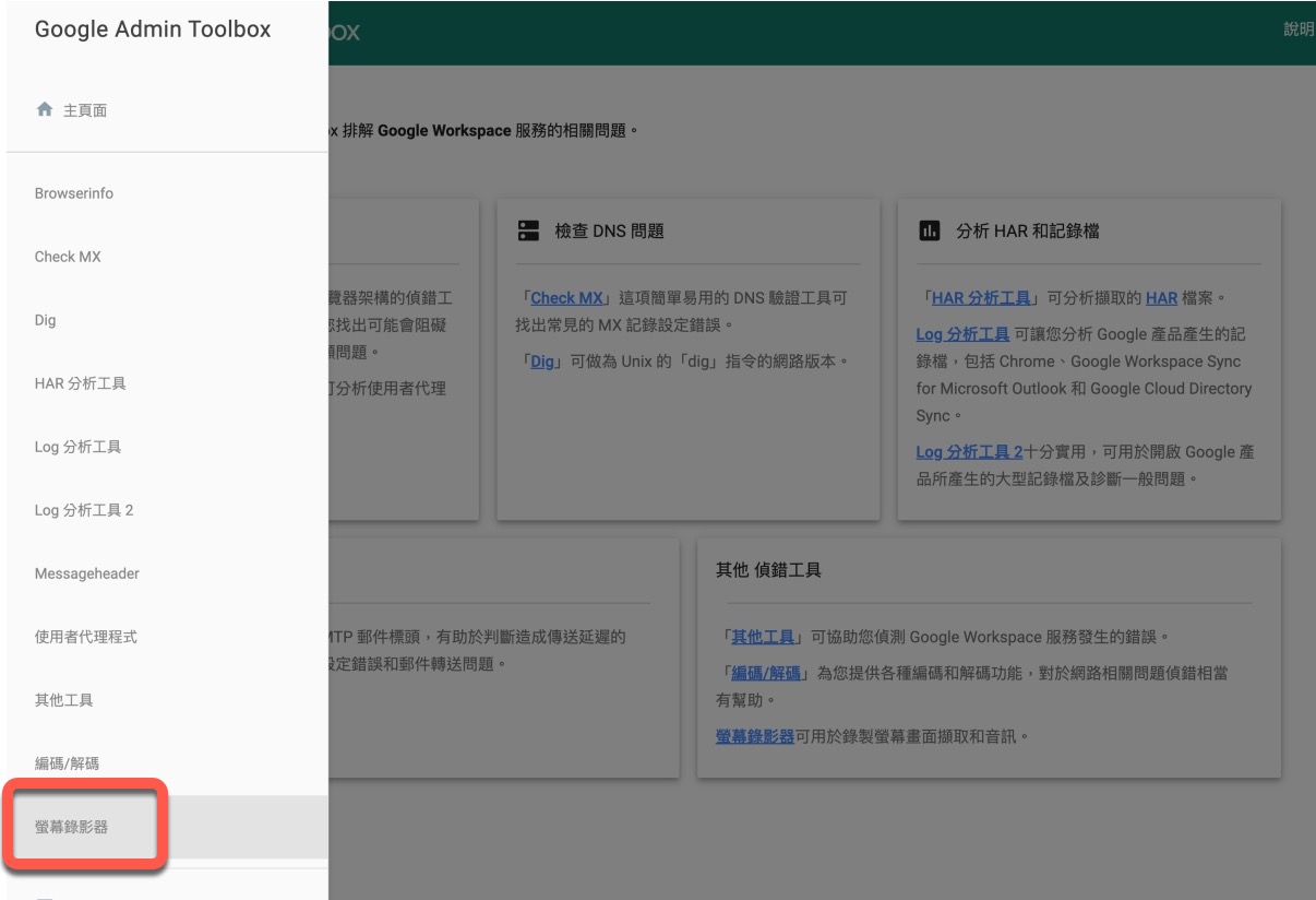有在使用 Google Workspace 的中小企業或個人,一般常遇到的問題大多是網域的 DNS 取多,還有其它各種問題,而我們比較需要排解的,可能會需要分析 HAR 及記錄檔等,或是像需要 DNS 工具來查詢設定,除此之外如果在操作時有什麼問題,也會需要螢幕錄影傳送給工程人員協助排錯,這時我們可以利用 Google Admin Toolbox 這個工具來搞定,除了各種排解問題的查詢工具外,主要就來介紹一下,附加的螢幕錄影功能,不用安裝,只要透過瀏覽器就能使用囉。