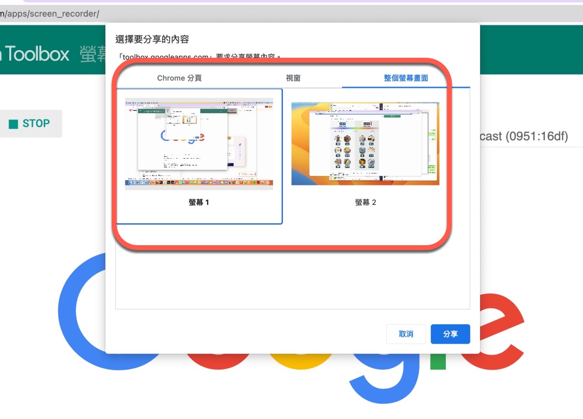選擇要錄製的螢幕範圍,可以是瀏覽器分頁,可以是某個軟體視窗,也可以錄製全螢幕,選擇好後,按右下角的分享就會開始錄製了。