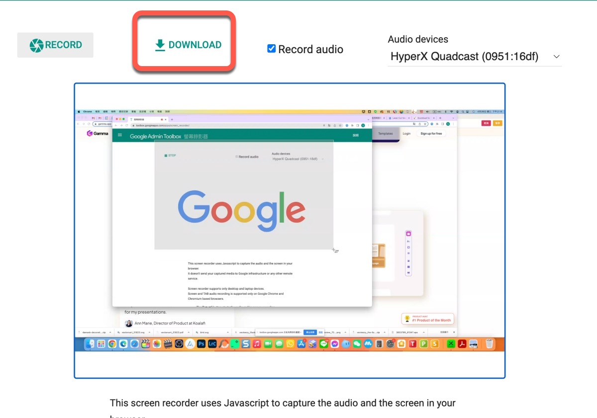當完成錄製時,在中間會顯示並可以預覽你錄製的內容,沒問題就可以點擊 Download 下載囉,相當的簡單易用,快去試看看吧。
