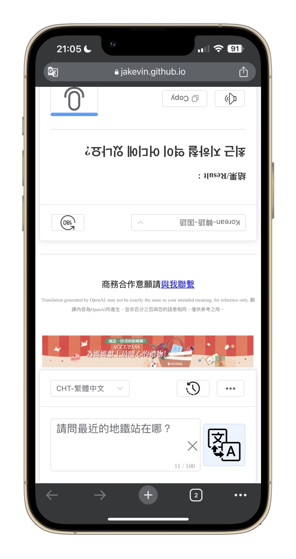 如果你是自己要看結果的,也可以把畫面翻轉過來,當做一般的翻譯工具來用也是不錯的哦。