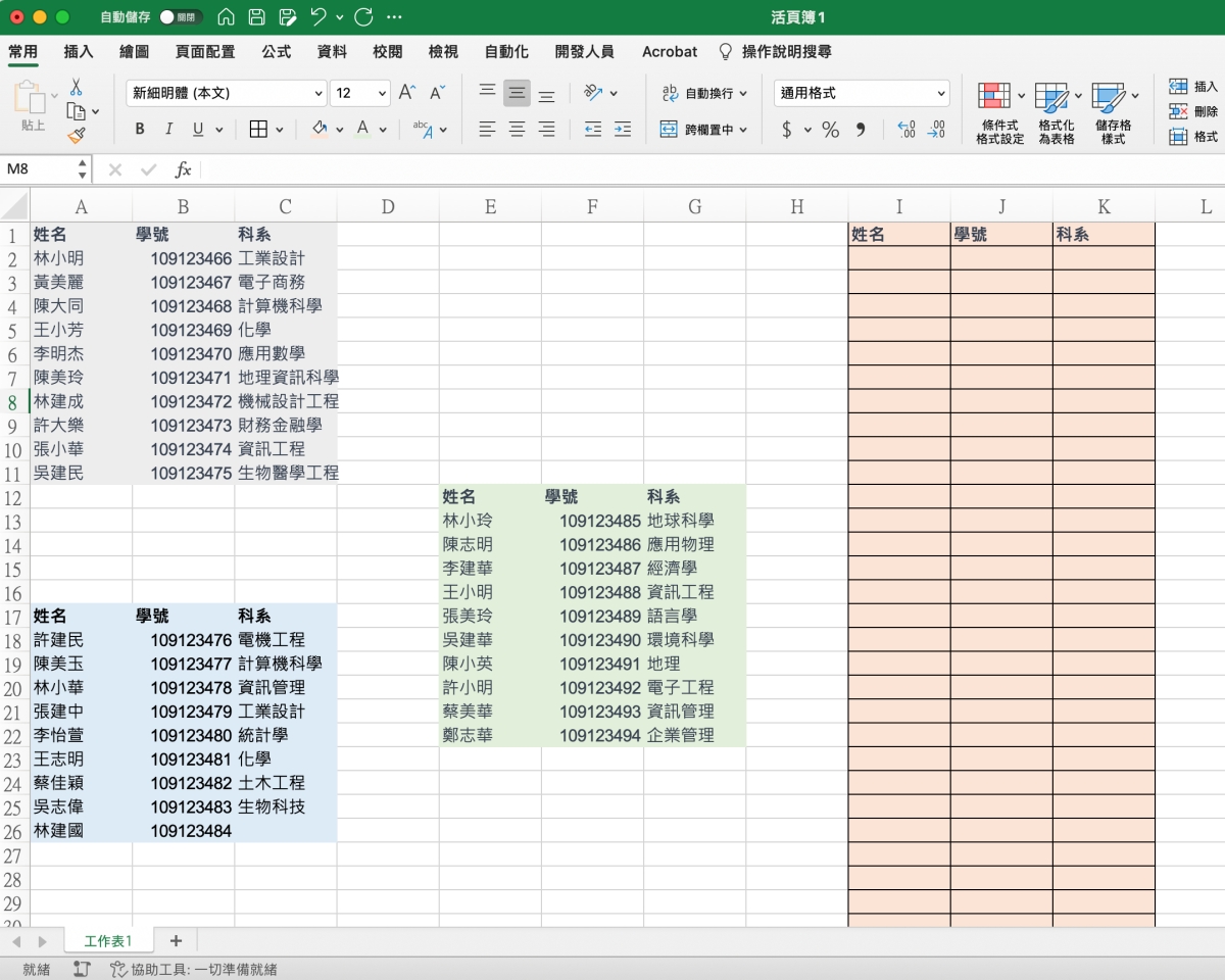 先給大家看一下我們要的需求是什麼,假設我今天有多筆表格資料散落在各地,我要怎麼在 I2~K2 開始合併這些表格資料?