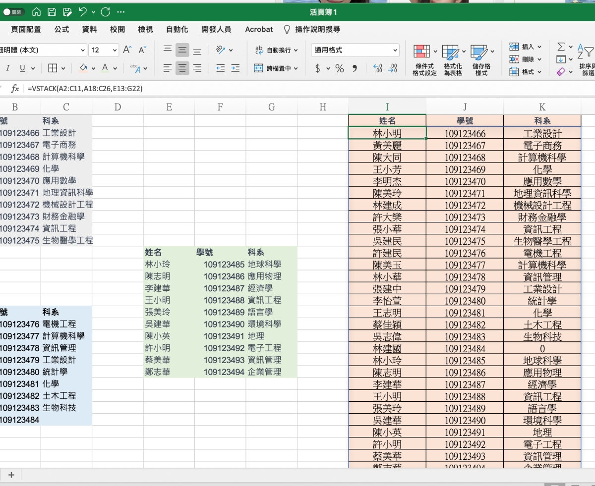最近被問 Excel 的頻率愈來愈頻繁,今天被問到的問題是,他在統整資料時,想要整理不同的分頁表格,合併在同一頁時,要怎麼做比較快,目前他的做法就是複製貼上,不知道還有沒有其它方式?其實如果要用函數來做,只要版本夠新,是可以用上新的函數 VSTACK,就能快速的將不同區域的表格進行合併,不需要一個個複製貼上,也不用搞的很複雜的函數,各別加入要合併的範圍就搞定。