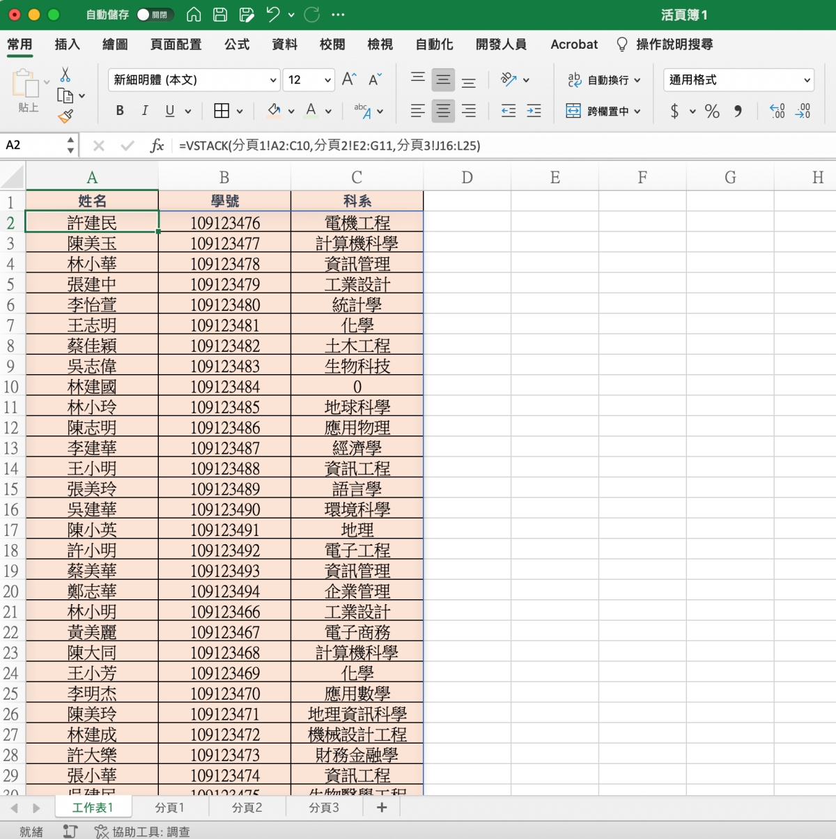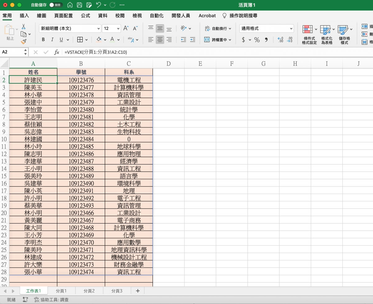 這樣就會將分頁1~分頁3之間的所有 A2:C10 表格合併一起。