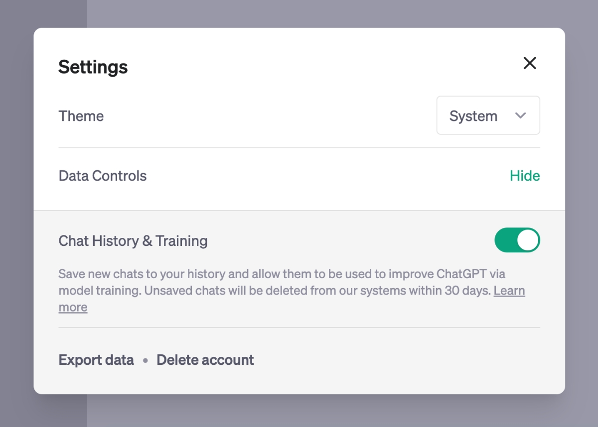 就可以看到 Chat History & Training 的選項,將它關閉後,日後你的問答記錄就不會再用於訓練 AI 使用,另外,如果想要下載目前的對話相關記錄,可以點擊左下角的「Export Data」。