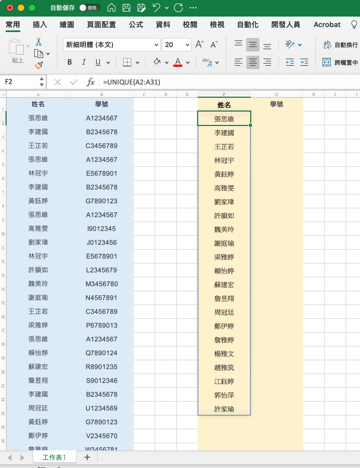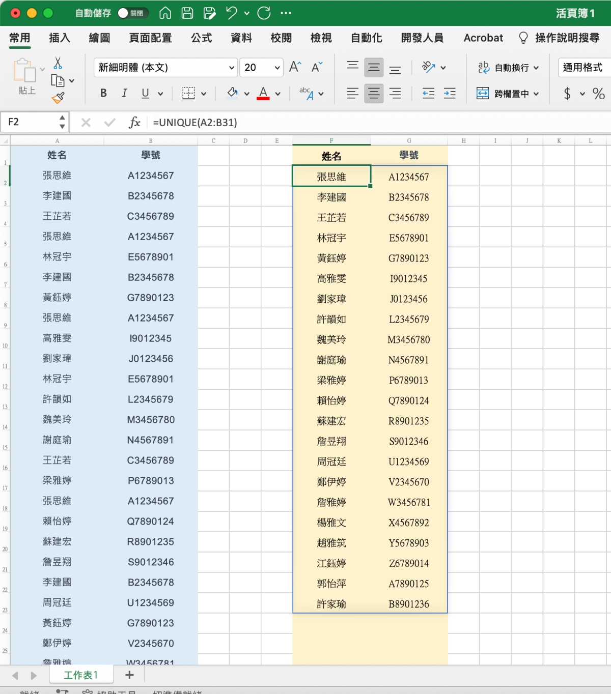 =UNIQUE(A2:B31)這邊注意一下範圍,如果像我這樣跨越 AB 二行的話,就代表會同時比對 AB 的資料,如果 A 重複但 B 沒有的話,就都是唯一的值,比如像是有人可能同名同姓,但學號不同,那麼你用這個公式來取出資料,就不用擔心只比對名字不夠準確,可以更精準的找出唯一不重複的值。