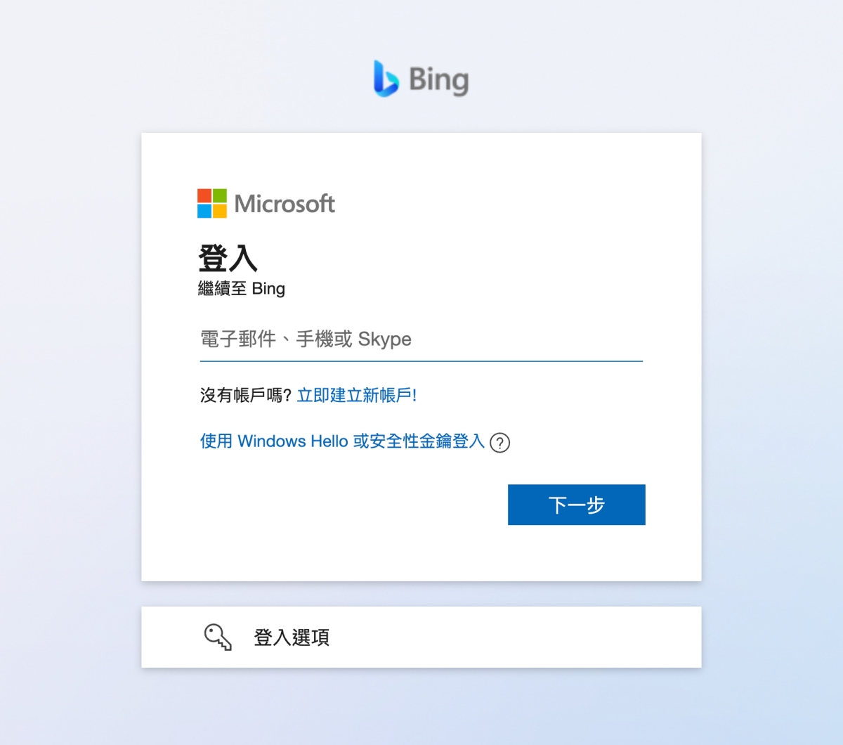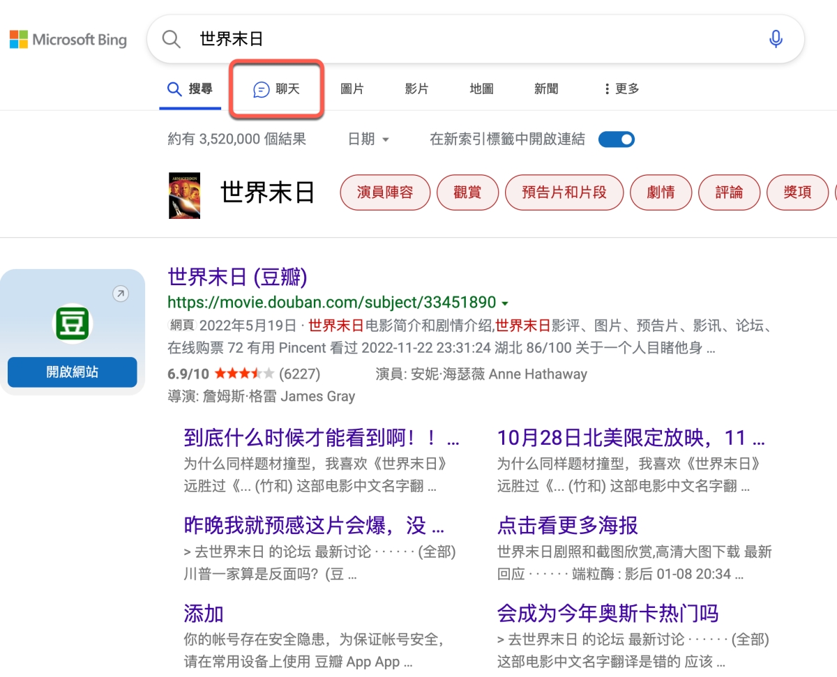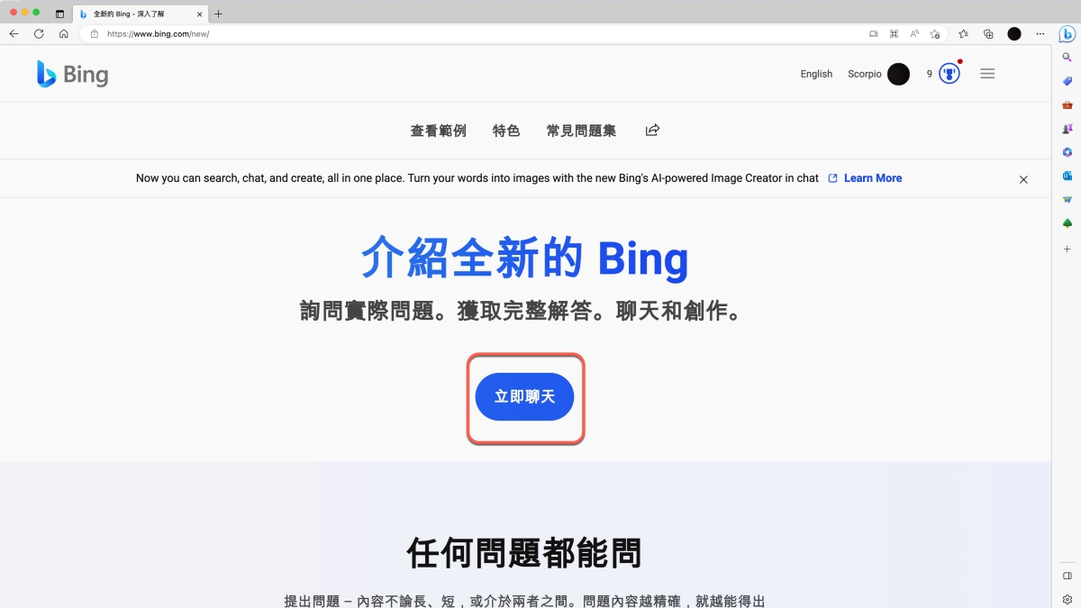 不過上面的步驟其實也可以更簡略一點,你只要使用 Edge 瀏覽器,登入 Microsoft 帳號的情況下,直接在 Bing 搜尋引擎中就可以看到聊天。