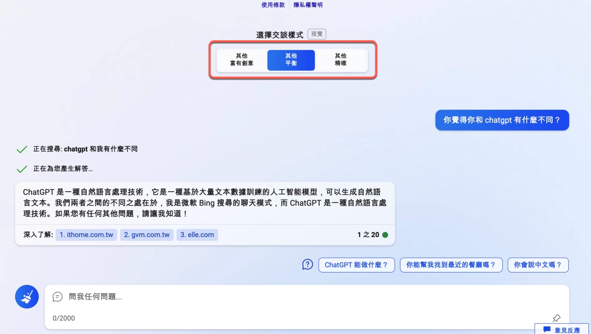 與 Bing AI 對話你可以選擇創意一點,一般或者精確,可以依據你需求來選擇回答的程度。